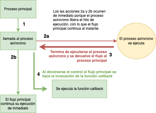 Para la realización de un proceso asíncrono generalmente tendremos que invocar una función que se encargará de producir ese proceso. A esa función le enviaremos como argumento la función anónima que hará de callback para retomar el control en el flujo principal de ejecución.