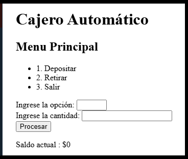 input para introducir la opcion del menu. input para introducir la cantidad de dinero. button para procesar la informacion. ConsultarSaldo, DepositarSaldo y RetirarSaldobutton que procese el menu Procura no copiar directamente la respuesta desde una IA